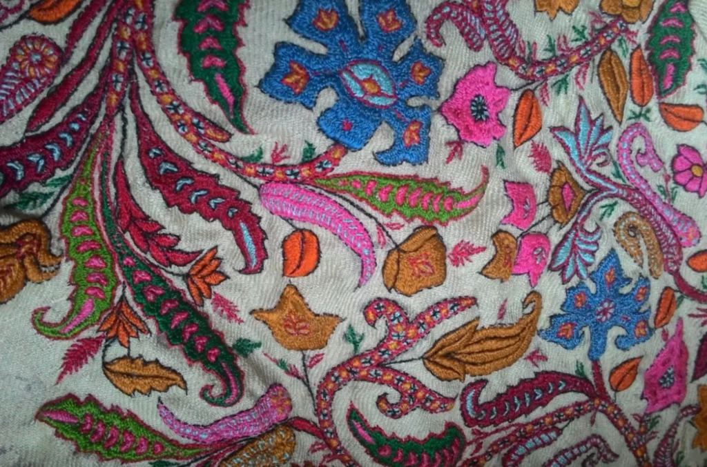 Fine hand embroidery on shawls, suits, and accessories highlights the skill and elegance of Kashmiri artisans.